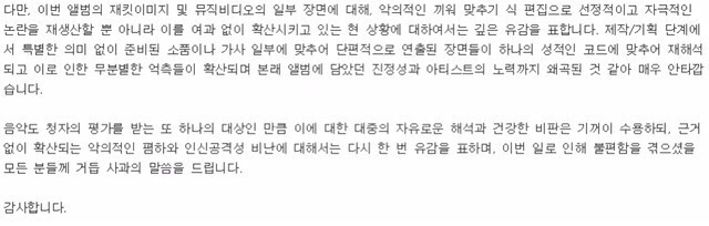 이 글로써 하고싶은말은 아이유는 본인이 일으킨 논란에 대한 피드백을 다했고,