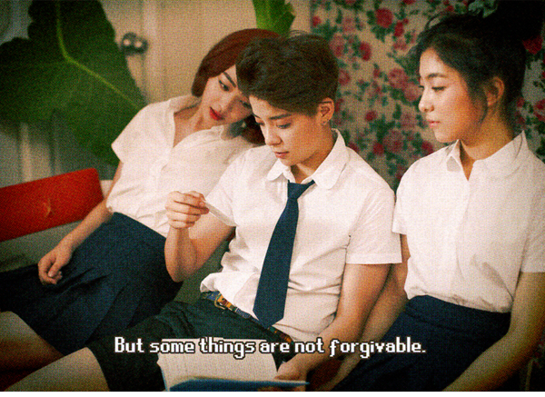 네. 첫사랑의 풋풋함을 상징하기 위해 교복을 응용했어요. 전형적인 교복이라기보다 교복의 뉘앙스만 빌려온 의상이죠. 전체적인 촬영 무드와 헤어, 메이크업의 표현에 있어 Asian적 터치를 가미해 나른하고 멜랑콜리한 이미지를 강조했어요. 촬영할 때도 일부러 나른한 올드 선샤인팝만 틀어놨었죠. 무국적, 다국적 정체불명 학생들의 괴상한 옴니버스를 그리듯이. 그 이미지들을 모아 이상한 핑크색 테잎안에 담고 싶었어요.