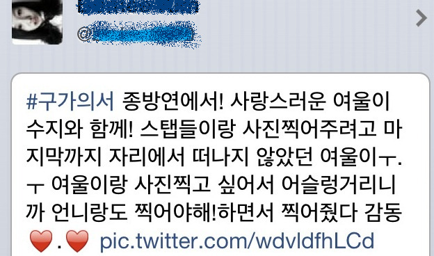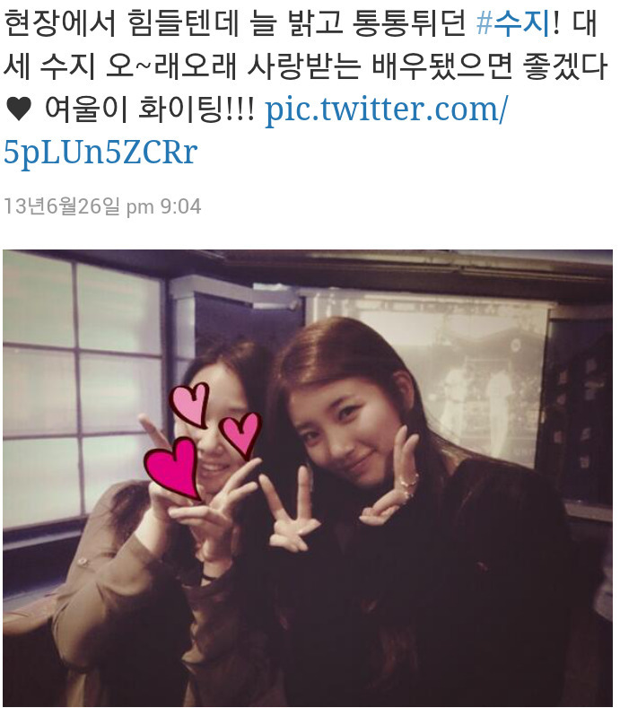 -현장에서 수지와 제일 친했다. 둘 다 비슷한 점이 많고 성격도 잘 맞는다. 수지가 밝고 착한 친구라 모난 데가 없다.