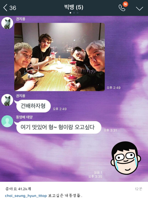 ㅠㅠㅠㅠㅠㅠㅠ탑형 진짜ㅠㅠㅠㅠ외로워할텐데ㅜㅠㅜㅜㅜㅜㅜㅜㅜㅜㅜㅜ역시 빅뱅은 빅뱅끼리 똘똘 뭉쳐서ㅠ ㅜㅜㅜ
