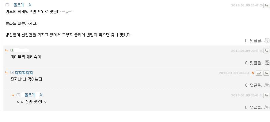 발단은 이거... 나는 정말로 맛잇을지도 모른다고 생각하고 집에 콜라가 잇길래 준비해서 먹어보기로 한다. 자 콜라, 밥, 그리고 반찬이다. 반찬은 저것밖에없다 김치도 없어. .. 가난하거든 김치 다 떨어졋다 사실. 자 말아본다. 자 이제 수저로 비벼보자. 완성됫다. 이제 한번 먹어본다. 는 fail. 개 맛없네 씨1벌노마 91