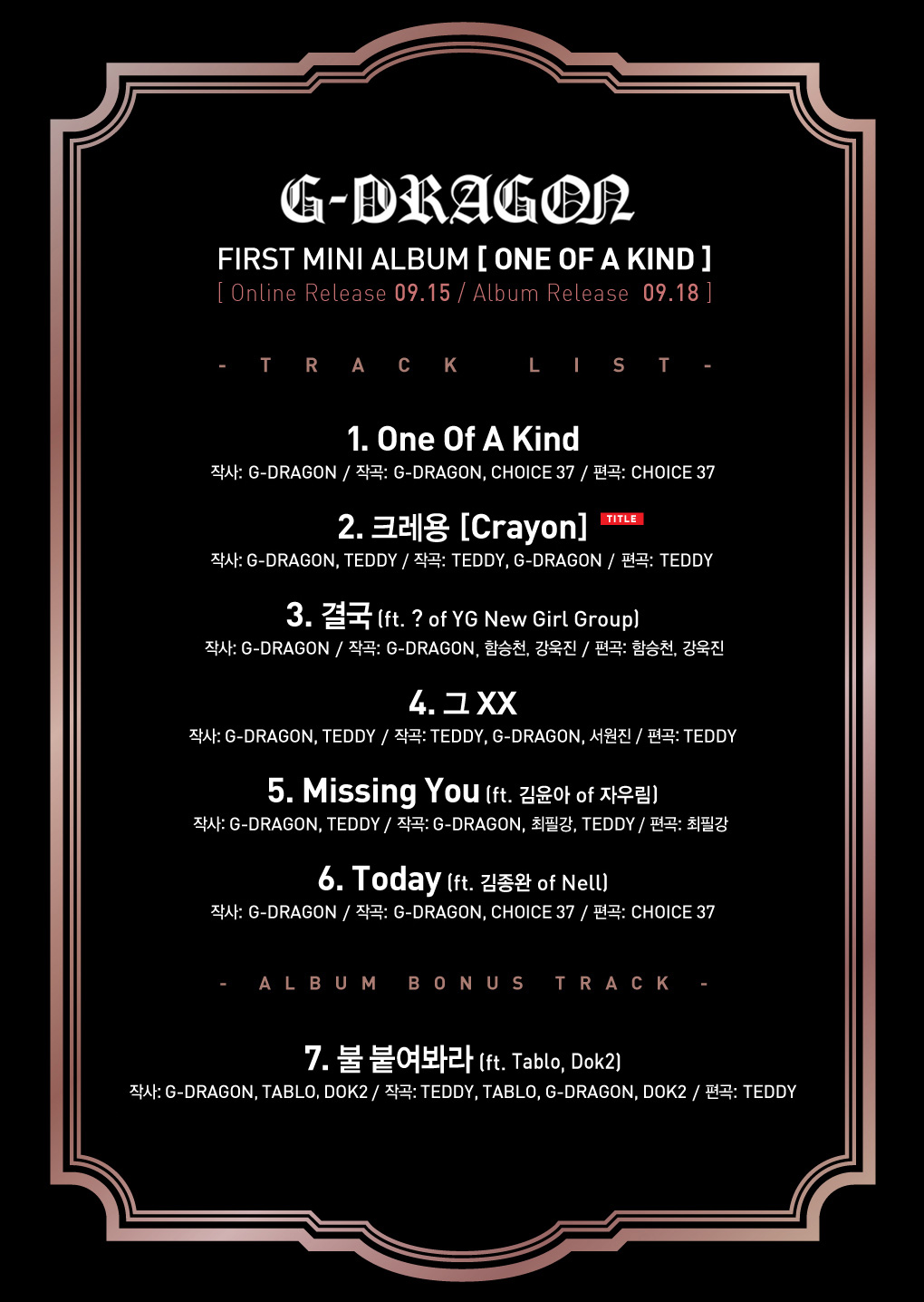 16일(일), G-Dragon 솔로 앨범 'ONE OF A KIND' 타이틀곡 크레용 MV 공개 예정