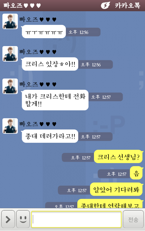 안녕하세여? 저도 클첸썰 참 좋아하는데여. 제가 한 번 풀어보겠습니다. 앞에 카톡에서 보신바와 같이 크리스는 루한이와 같은 듯 다른 종대네 학교 영어 교생 선생님이에여. 종대네 학교 교장은 아무래도 여자인 듯 싶네여. 루한에 이어 크리스라니...... 전학가야겠어. 여튼 그러한데 처음부터 종대가 크리스를 좋아한 건 아니었어여. 여기서 좋아한다는 호모호모 열매를 먹은 그런 게 아니라 순수한 호감도예여 종대네 학교는 한 번도 남학교라고 말한 적 없어여 남녀공학ㅇㅇ 종대는 남녀노..소...? 누구에게나 사랑받는 종대네 학교 인기스타예여. 물론 자칭이지만... 그래도 한 가지 확실한 건 여자애들한테 사랑은 받고 있어여ㅇㅇ 가끔 집에 쌓이는 빼빼로와 초콜렛을 보면 알 수 있져. 애교가 많은 스타일이라서 오히려 남자들이 우우 하고 여자들이 좋아하는 스타일, 느낌 아시잖아여? 저와 같이 종대의 매력에 허덕이고 계시면서(찡긋) 여튼 그런데 준면이는 약간 여자애들이 다가오면 좀 멀리하는 스타일이라면 종대는 여자애들=먹을 것을 줌 이라는 공식 하에 헤헤헤헤 애교를 퍼다나르는 스타일. 근데 크리스가 교생으로 오고나서 종대의 사랑들이 전부 크리스에게로 가여. 헐 내 초콜렛... 내 빵.. 내 우유... 종대의 지금 심정은 그냥 멘붕이겠져? 근데 또 여자애들을 미워하면 그나마 조금씩 조공오는 먹을 것도 먹지못할 지도 모르니까 타겟을 크리스로 변경 괜히 틱틱대고 다녀여. 크리스 수업시간에 괜히 수업 안듣는 티내면서 앉아있고, 괜히 딴 책 공부하고, 크리스가 부르면 못들은 척 딴청피우다가 친구가 찌르면 그제야 일어서고ㅇㅇ 반항 아닌 반항을 하는거져. 내 간식의 원수!!!!!!! 같은 거ㅇㅇ 그랬는데 크리스는 미치고 팔짝 뛰겠져? 수업을 듣는데 첫제자가 저모양이라니..... 고민고민을 하던 크리스에게 루한이 민석에 관한 얘기를 하면서 민석과 준면과 종대와 종인은 형제. 준면과 종대와 종인은 형제. 준면과 종대는 형제. 크리스는 벌떡 일어나서 준면이에게 도움을 요청하겠져. 준면이는 크리스의 말을 듣고 멘붕. 우리 종대 수업태도가........ 준면이가 화가 나서 졸지에 크리스와 종대와 준면이의 삼자대면을 갖게 되여. 물론 그런 준면이의 결단력에 당황당황 크리스도 당황당황 종대도 당황당황 종대는 크리스를 보고 으어어어어 내 원수우우우 인데 준면이가 옆에 있으니까 뭐라 대놓고 반항도 못하고 그냥 시선 피하는 걸로 소심한 반항을 해여 그러다가 준면이가 묻겠져. 너 크리스 선생님께 왜그래? 수업태도가 그게 뭐야 솰라솰라 김준면 님께서 잔소리 스킬을 시전하셨습니다. 종대는 종대 나름대로 억울하고 크리스는 이유라도 들어보자란 생각으로 가만히 있어여. 그러다가 끝나지 않는 준면이의 잔소리에 뭐라 한마디 할려던 찰나 종대가 말하겠져. 여자애들이 다 크리스쌤만 좋아한단 말야! 나한테 이제 먹을 것도 안주고! ....제가 썼지만 이게 뭔가 싶네여. 여튼 그렇게 이유를 안 준면이가 어이를 상실한 사이에 정확하게 이유를 파악해낸 크리스가 해결책을 내놓아여. 그럼 여자애들이 주는 먹을 거 종대랑 나눠 먹으면 선생님 안 미워할래? 종대는 그 말에 솔깃하지만 남자가 자존심이 있지! 는 무슨 먹을 거 앞에 자존심이 어딨나여 종대에게. 쫌 팅기는 척 하다가 좋아여. 제가 비록 먹을 거에 넘어가는 쉬운 남잔 아니지만 크리스 쌤의 노력을 봐서 먹을 거 먹어드릴게여. 그 이후로 먹을 것과 함께 나누는 정, 초코파이 정. 초코파이는 마쉬멜로가 들어서 살이 엄청 찌니까 조심하세여. 근데 엄청 맛있졍. 초코파이가 맛있어서 급격히 크리스와 가까워진 종대와 그런 종대를 지켜보다 어이를 상실한 백현이의 kakaotalk.
